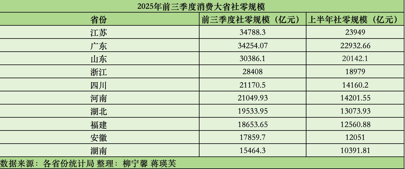 和上半年相比,前三季度,我国消费大省前十名的排名仅有一处变化,四川社零总额超越河南,位列全国第五。