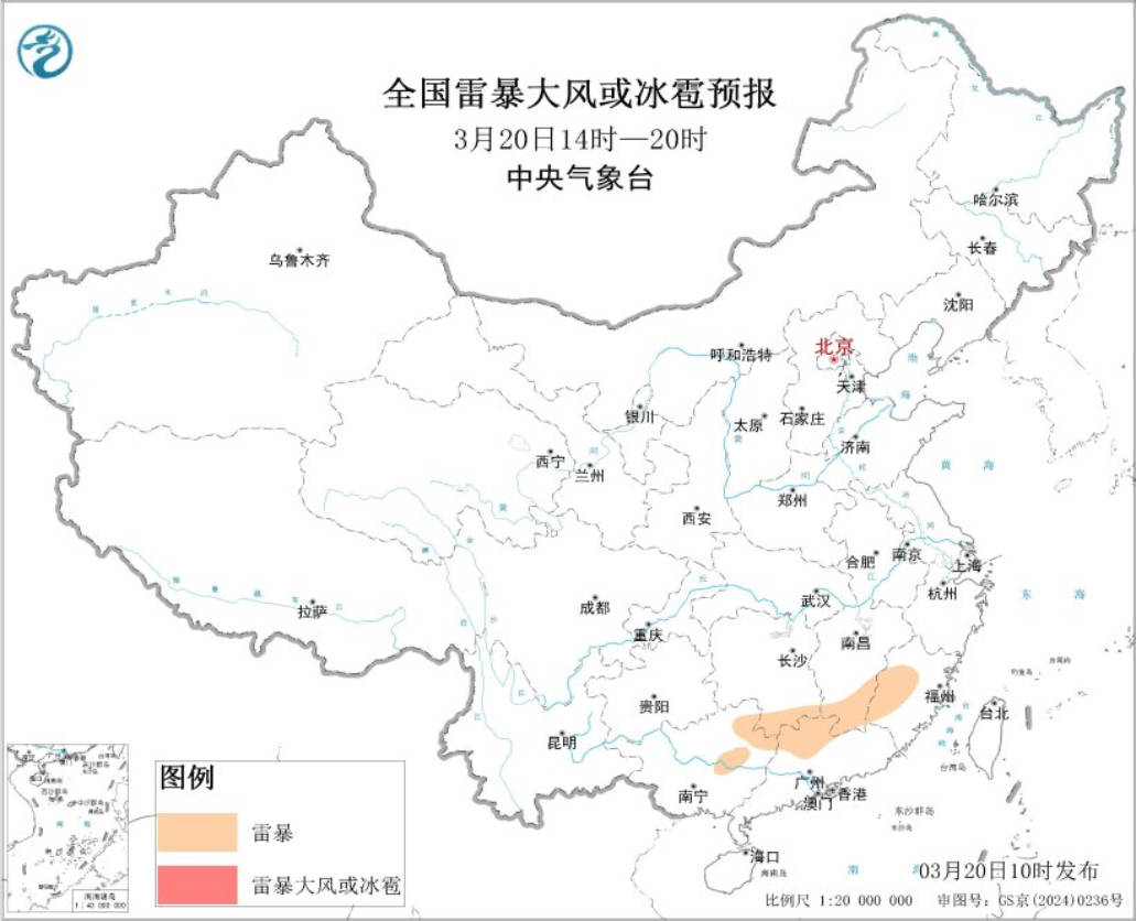 预计3月20日14时至21日08时,湖南南部、江西南部、福建中西部、广西东部、广东中北部等地的部分地区将有雷暴。
